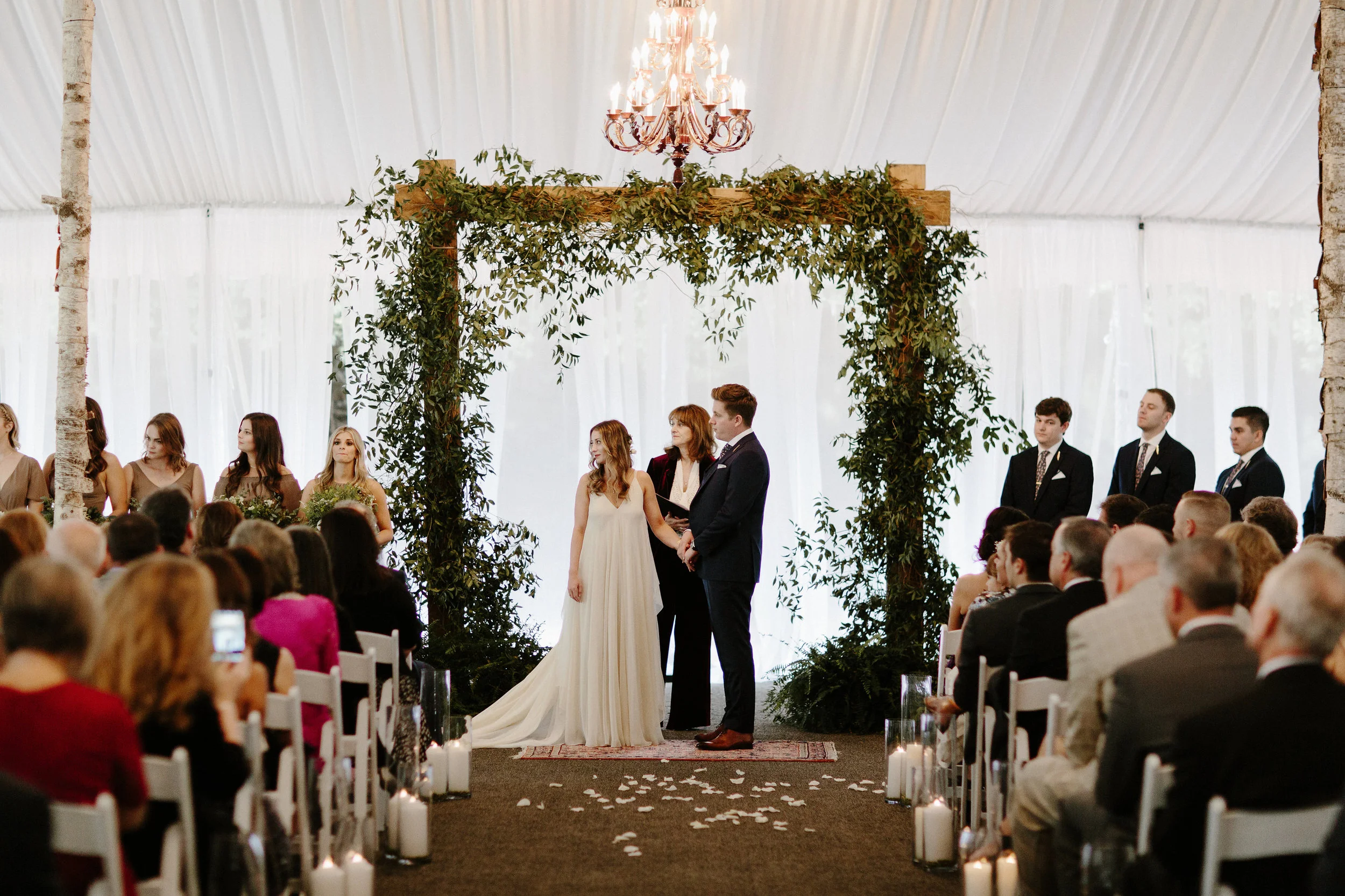 This couple has style; Carly stunned in a flowy Carol Hannah gown and Reis looked so handsome in a bespoke suit. After the I Do's, the rain started to fall, so guests entered the atrium for cocktails and hors d'oeuvres. For the the reception, dinner was served along greenery laden farm tables. After cake and some moving toasts, the party really kicked up as the band brought all to the dance floor. The night was sprinkled with guests scurrying out to the photo bus, umbrellas in hand, to take a few pics with friends. Lastly, the couple said farewell with a scamper through waving American Flags & Union Jacks!